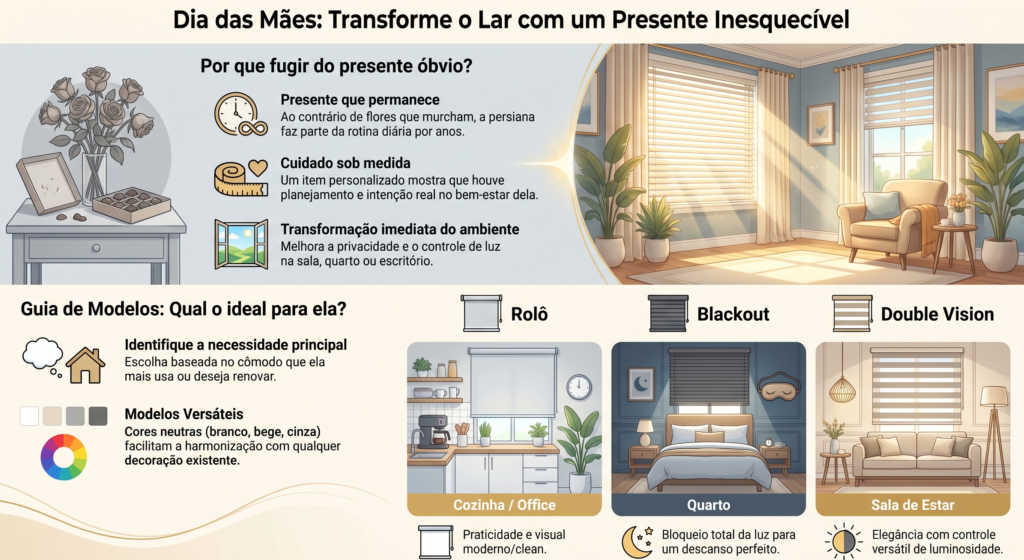 Enquanto outros presentes são usados por pouco tempo, uma persiana continua ali, fazendo parte da rotina. Todos os dias, quando sua mãe abrir ou fechar a persiana, ela vai lembrar do cuidado por trás daquela escolha.