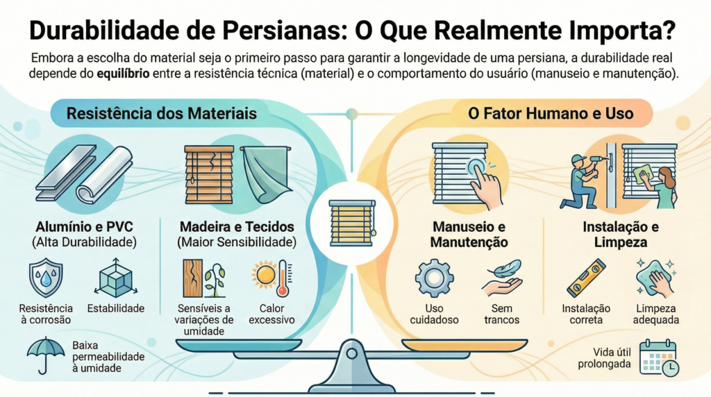Só que a resposta mais honesta é outra: a persiana que mais dura é a que combina material certo, ambiente certo, uso correto e instalação bem feita.